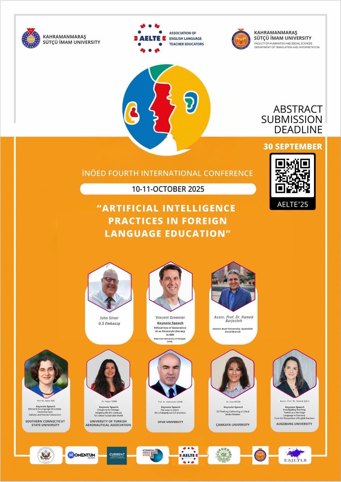 Bölümümüz ve İngilizce Öğretmeni Eğitimcileri Derneği işbirliğiyle 10-11 Ekim 2025 tarihinde düzenlenecek olan "Yabancı Dil Eğitiminde Yapay Zeka Uygulamaları" temalı 4. Uluslararası AELTE Konferansı'nın açılış töreni, 10 Ekim 2025 Cuma günü saat 09.30'da Yunus Emre Kongre Merkezi'nde gerçekleştirilecektir. Üniversitemiz akademik ve idari personeli ile tüm öğrencilerimiz davetlidir.